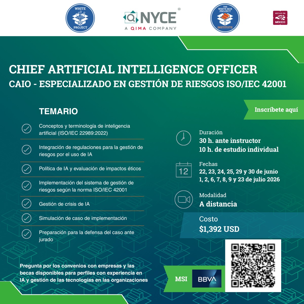 Creado para las empresas que desean contar con un supervisor de inteligencia artificial con los conocimientos necesarios para la implementación de un sistema de gestión de riesgos basado en la norma ISO/IEC 42001:2023 Information Technology – Artificial Intelligence Management System. El curso permite al participante tener los elementos teórico-prácticos necesarios para iniciar el proceso de implementación de un sistema de gestión y, en su caso, la atención de una auditoría realizada por un tercero, con el fin de proteger su modelo de negocio.